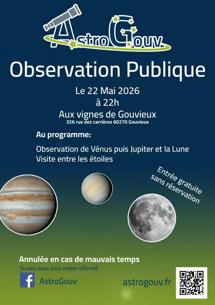 AstroGouv organise une soirée d’observation astronomique le 22 mai 2026 à partir de 22h aux Vignes de Gouvieux. Au début de la nuit, les participants pourront observer Vénus, particulièrement brillante à cette période. La soirée se poursuivra avec l’observation de Jupiter et de la Lune, visibles à travers les télescopes mis à disposition.